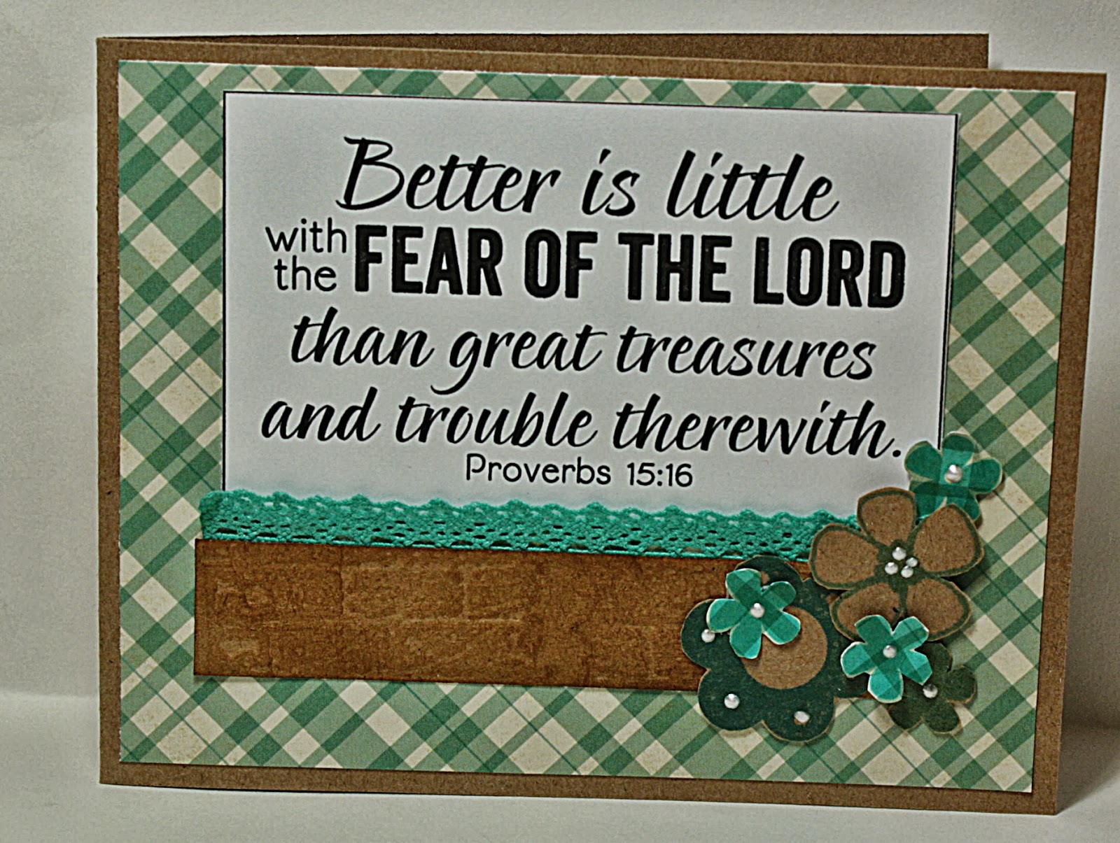 This verse from Proverbs is so appropriate for this time of year when things get overwhelmed with commercialism and we have a tendency to forget to be thankful and content. This card is truly meant to be an encouragement to someone who may be struggling with that very thing. Wisdom and knowledge begin with the reverent fear of the Lord. Sometimes we need a good friend to keep us accountable and remind us to keep our eyes on our Lord Jesus Christ.