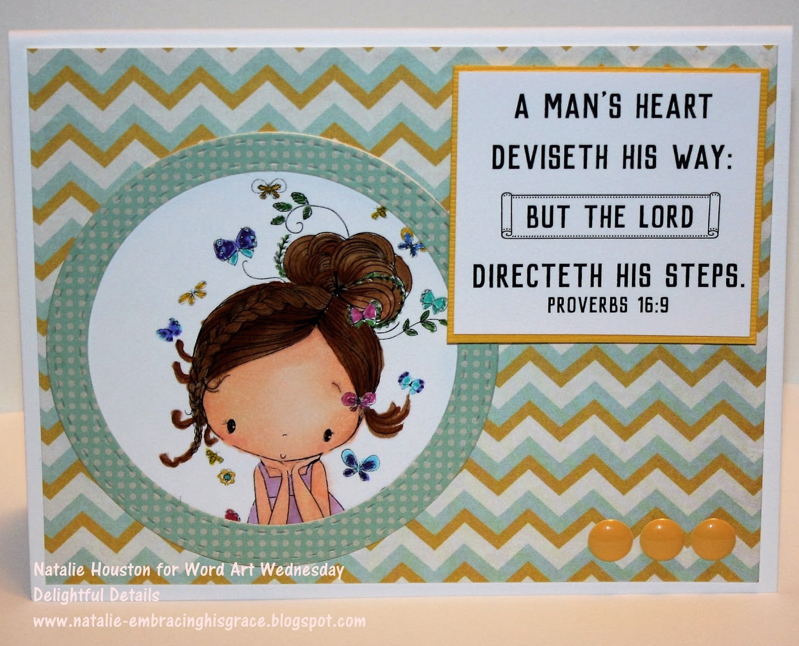 I wanted to make the image look like she was looking in/ or/ out a window so I framed her by die cutting the Stitched Circle die from Simon Says Stamp! I used two of the dies to cut out the pattern paper. I used a piece of scrap paper from my stash and it matched perfectly with the background designer paper from Fancy Pants called Park Bench, I've been hording saving this paper for quite some time! I've colored this little darling with Copic Markers and then used the Atyou Spica glitter pens to color the teeny tiny flowers, greenery, butterflies and bees. I love the braid in her hair and the green garland! This image is called Waiting for Summer, isn't she the sweetest? I've added three enamel dots to embellish so this card was easy to assemble. This weeks Scripture comes from Proverbs 16:9 and I've cut it down and matted it with yellow card stock.